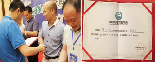 峰會上收獲滿滿,13日當晚中進藥業總經理陳紅鋼受聘為中國藥店管理學院副院長,并由副總經理肖文生代為出席授聘儀式。