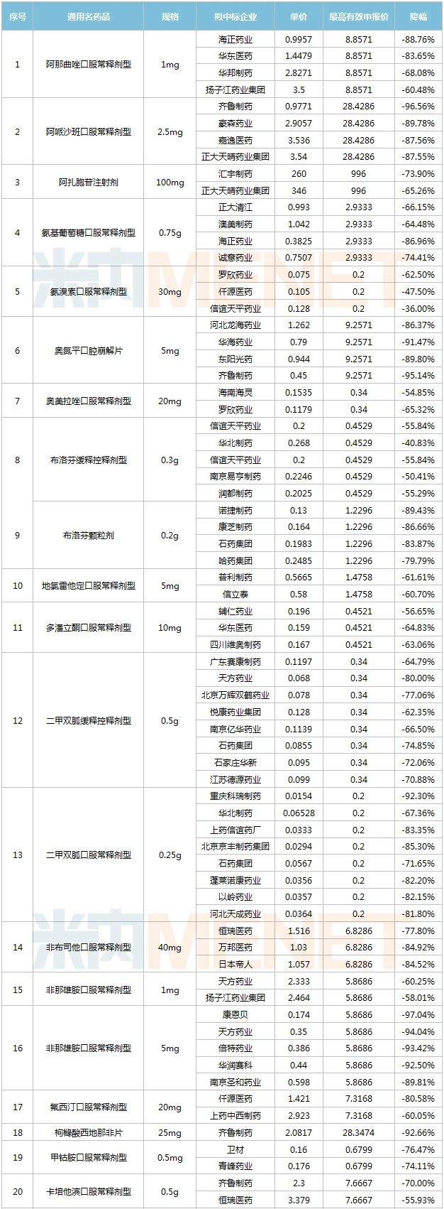 16個品種出現“大殺價”,降幅超過90%,其中齊魯的阿哌沙班、康恩貝的非那雄胺、重慶科瑞制藥的卡托普利、石藥及齊魯的美金剛、齊魯及先聲的托法替布降幅超過95%。