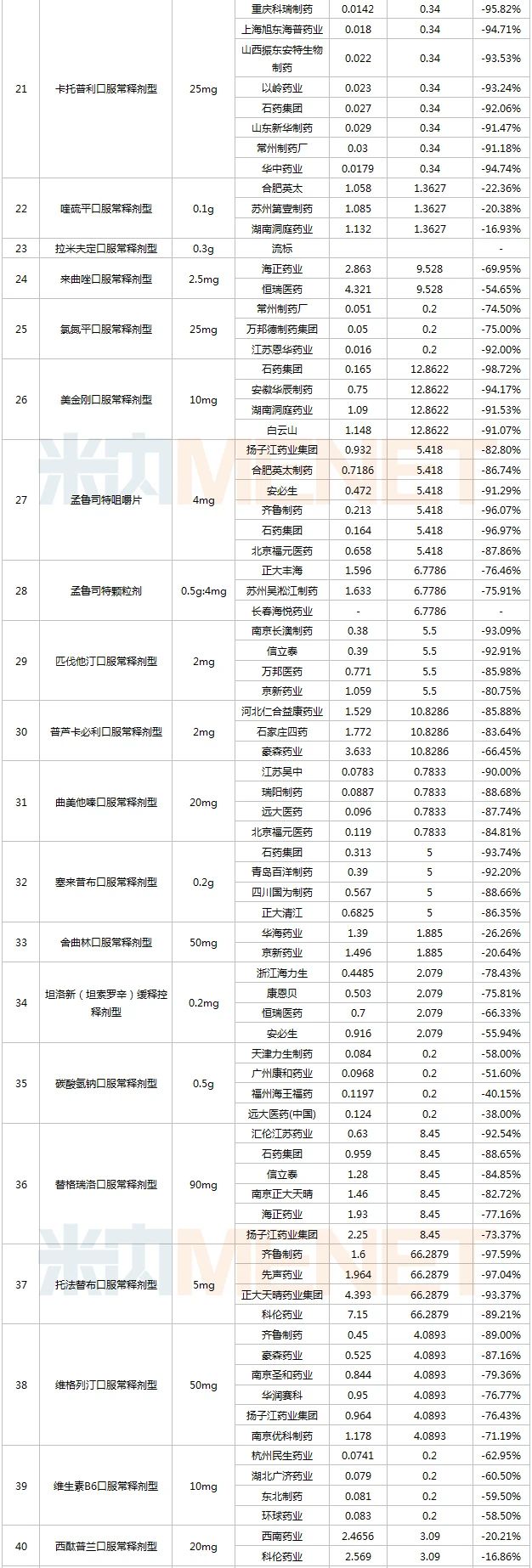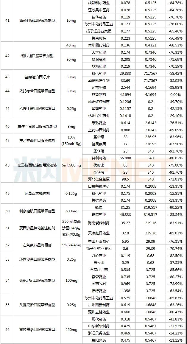 湖南洞庭藥業的喹硫平、科倫的西酞普蘭、齊魯的依托考昔、山東魯抗及科倫的阿莫西林顆粒、貝得藥業及東陽光藥的克拉霉素降幅均在20%以下,這跟企業的報價策略及品種的競爭情況有較大關系。