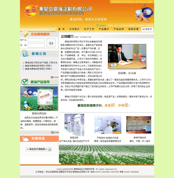 豪瑞淀粉有限公司位于河北省秦皇島市昌黎縣龍騰經(jīng)濟(jì)技術(shù)開(kāi)發(fā)區(qū),是國(guó)內(nèi)生產(chǎn)高標(biāo)準(zhǔn)凈化淀粉的專業(yè)廠家,主要生產(chǎn)馬鈴薯、紅薯、紫薯等優(yōu)質(zhì)淀粉。年產(chǎn)量6000噸-8000噸,產(chǎn)品暢銷津、京、華北、東北等地區(qū),以及出口韓國(guó)市場(chǎng)。公司為了適應(yīng)市場(chǎng)需求,發(fā)展綠色食品,增強(qiáng)企業(yè)競(jìng)爭(zhēng)能力,與秦皇島市秦泰薯類研究開(kāi)發(fā)中心合作,引進(jìn)具有先進(jìn)水平的進(jìn)口淀粉生產(chǎn)設(shè)備以及先進(jìn)的生產(chǎn)技術(shù),產(chǎn)品質(zhì)量達(dá)到國(guó)家出口標(biāo)準(zhǔn),同時(shí)公司還針對(duì)國(guó)外客戶對(duì)調(diào)制淀粉的需求,設(shè)有淀粉混合車間,擁有淀粉混合專用設(shè)備,質(zhì)量檢測(cè)手段先進(jìn),建立了一整套完備的質(zhì)量管理體系。公司于2002年取得國(guó)家進(jìn)出口檢驗(yàn)檢疫局頒發(fā)的檢驗(yàn)衛(wèi)生注冊(cè)登記證書,產(chǎn)品質(zhì)量深受國(guó)內(nèi)外客戶的信賴和歡迎。目前公司已同國(guó)外客戶建立了密切的業(yè)務(wù)聯(lián)系,公司嚴(yán)格履行業(yè)務(wù)合同,獲得了良好的企業(yè)信譽(yù),經(jīng)濟(jì)效益逐年遞增。