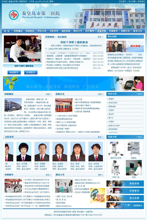 秦皇島市第二醫院建院百余年,經過幾代人的不懈努力,醫院從原不足20名醫務人員規范很小的教會醫院發展成一所集醫療、科研、教學、預防為一體的三級綜合醫院,為冀東人民的健康做出了貢獻,特別是現任領導班子的組建,給醫院帶來了新的生機和活力。醫院現開放床位502張,擁有職工852人,其中專業技術人員671人,醫療、醫技人員334人,護理人員321人,高級衛生技術人員80人,中級衛生技術人員213人。
