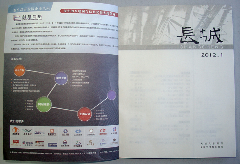 新年伊始,創想網絡做為秦皇島開發區的明星推薦企業,榮登全國中文核心期刊《長城》的封面。《長城》期刊由河北省作家協會主辦,是中國中文核心期刊,同時被美國國家圖書館館藏。