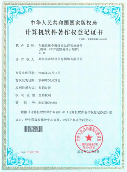 創(chuàng)想易維全媒體云站群系統(tǒng)軟件著作權(quán)證書日前正式獲得國家版權(quán)局批準(zhǔn),創(chuàng)想公司在云平臺、智慧型、大數(shù)據(jù)應(yīng)用的自主產(chǎn)品研發(fā)的道路上將奮勇前進,越飛越高。